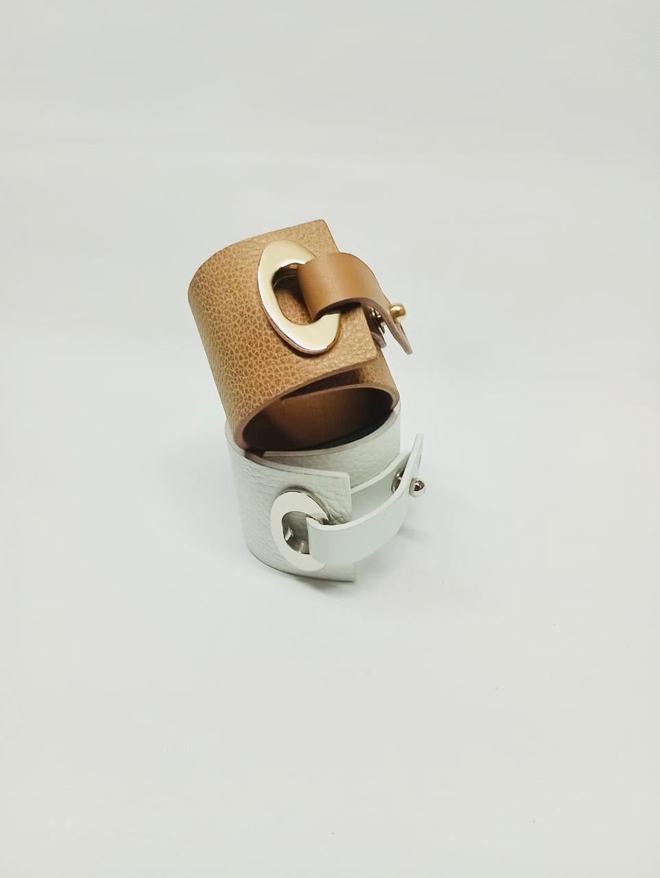 Brazalete en cuero blanco graneado y herraje color plata. Un color básico y salvador que ya se posiciona como indispensable para todo el año.