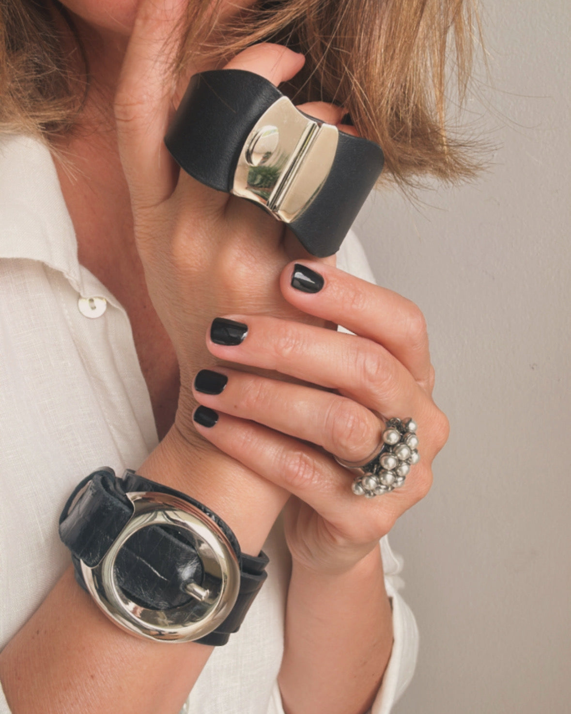 Brazalete en cuero negro croco y hebilla color plata. Un toque súper canchero y con mucha onda para tus looks de día y noche si sos team total black